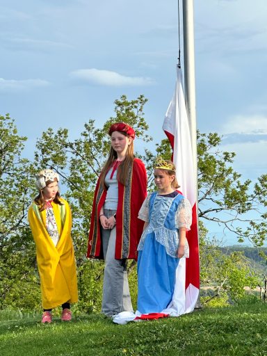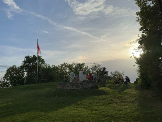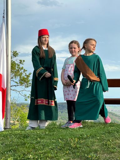 Die Kinder der Volksschule Paudorf führen das Spiel vom Kampf des heiligen Georg mit dem Drachen auf. Pater Udo inszeniert dieses kleine Freilufttheater auf der Wiese bei der wiederentdeckten Georgskirche auf dem Göttweiger Predigtstuhl.